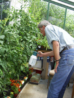 Tending the tomatoes in 2006 - soon there'll be a new greenhouse