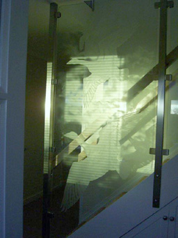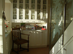 Thorneybush hall, Christmas 2009, with winter sunshine on the china cabinet and the steel and glass staircase