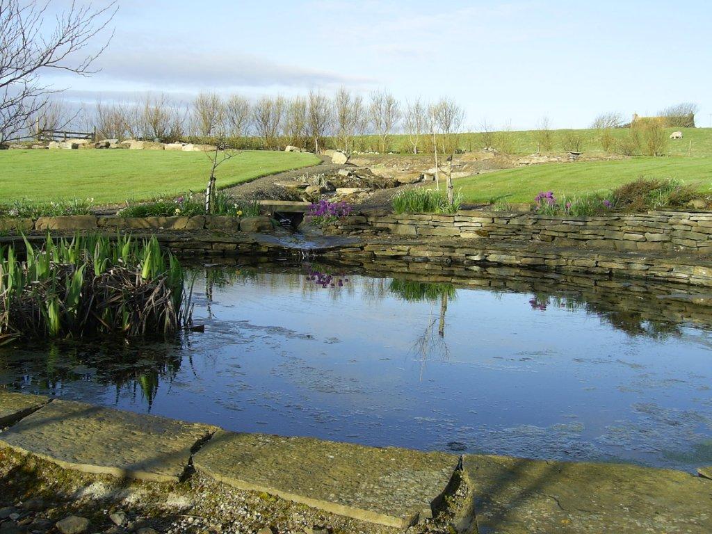 The stream flows into the bottom garden pond